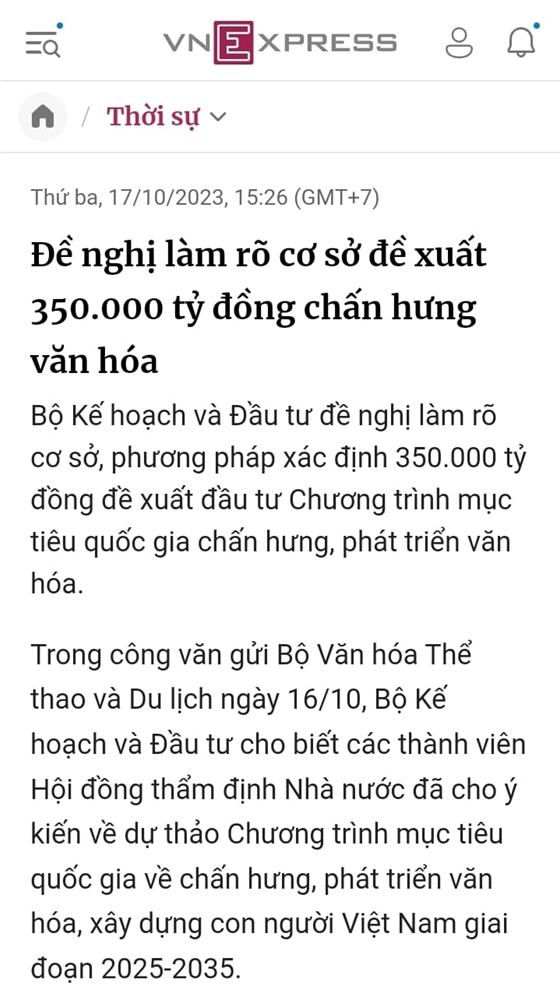 Không biết là Bộ VH-TT-DL đang đòi tới 350k tỷ đồng để chấn hưng văn hóa từ năm 2025-2030 thì các vị có nghĩ đến câu chuyện này không?