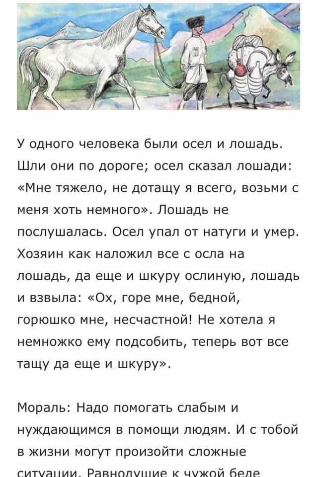“Người đàn ông nọ có một con lừa và một con ngựa. Trên đường đi, lừa nói với ngựa:"Mình thấy nặng quá, mình nghĩ có lẽ không chở hết được, bạn có thể giúp mang bớt hộ mình một ít đươc không?".