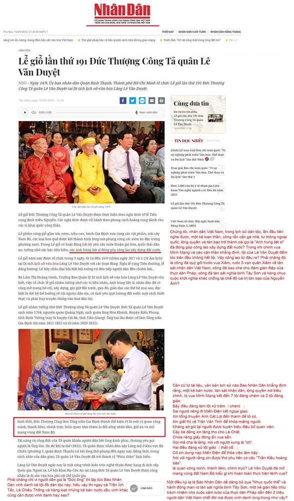 Thứ Năm, ngày 14/09/2023 Báo Nhân Dân có bài viết có tiêu đề: “Lễ giỗ lần thứ 191 Đức Thượng Công Tả quân Lê Văn Duyệt” với nội dung: “Ngày 14/9, Ủy ban nhân dân Quận Bình Thạnh, Thành phố Hồ Chí Minh tổ chức Lễ giỗ lần thứ 191 Đức Thượng Công Tả quân Lê Văn Duyệt tại Di tích lịch sử-văn hóa Lăng Lê Văn Duyệt.”