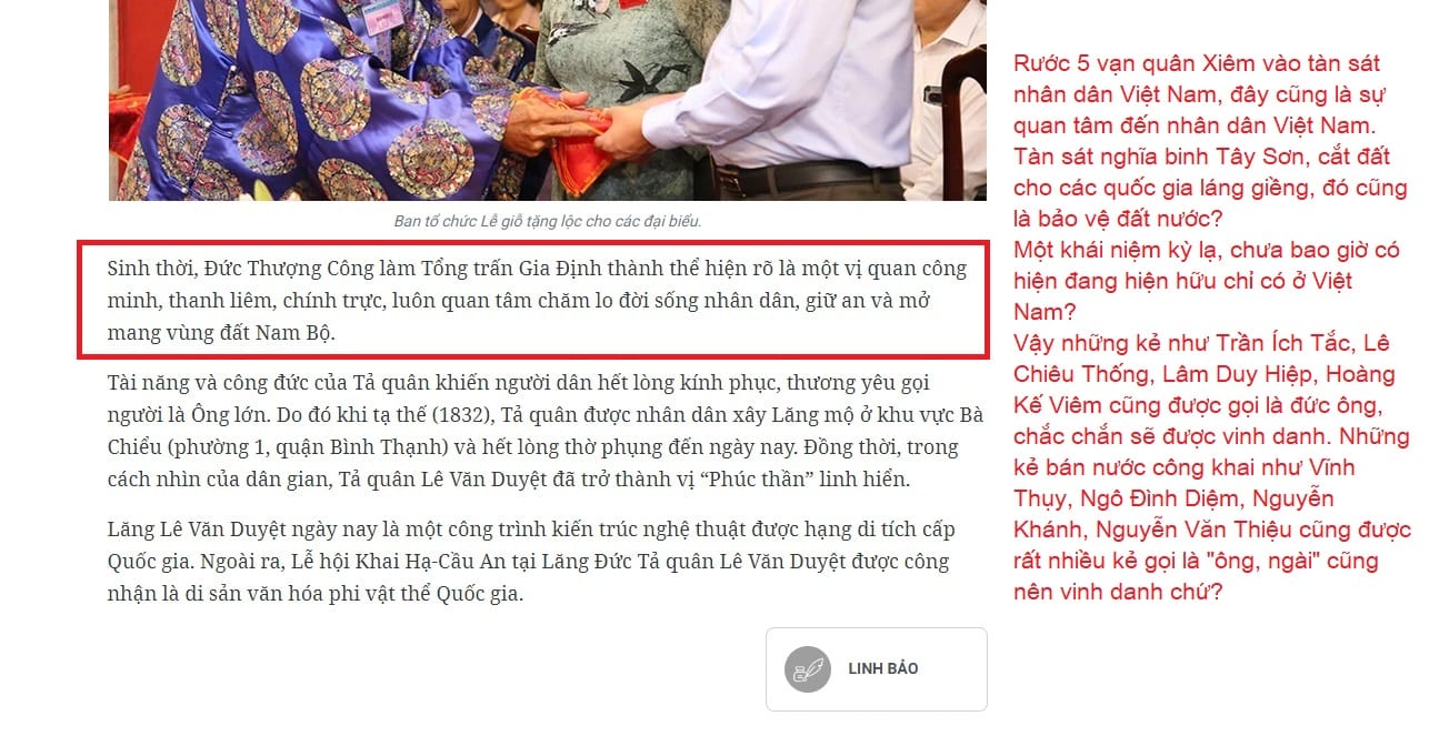 Phải chăng chỉ vì người dân địa phương gọi đó là lăng “đức ông” thì lập tức Báo Nhân Dân phải vinh danh hay sao? Nói như vậy thì trong lịch sử Việt Nam, những kẻ bán nước cầu vinh như Trần Ích Tắc, Lê Chiêu Thống, ở địa phương người dân vẫn gọi là “đức ông” và cũng cần phải vinh danh theo quan điểm của tòa báo???
