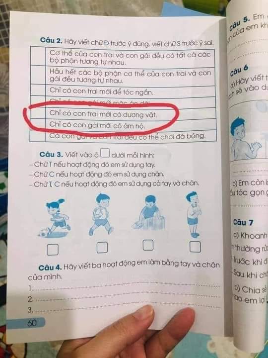 Không thiếu gì ví dụ để có thể đưa ra một bài tập dạng trắc nghiệm lựa chọn đúng sai như dưới đây mà vẫn đảm bảo yêu cầu kiến thức để giáo dục, dạy dỗ trẻ em 7 tuổi. Thế nhưng họ lại lựa chọn một sự thô tục, thô lỗ nhất để dạy dỗ đứa trẻ 7 tuổi. Những từ ngữ, những khái niệm mà người lớn hay những cô cậu thanh thiếu niên còn thấy ngượng đỏ mặt khi nói đến một cách thô bỉ như vậy.